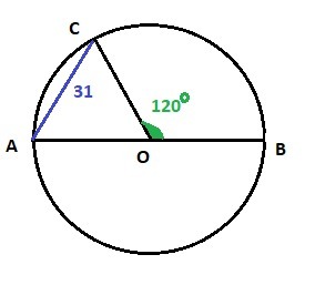 В окружности с центром O проведён диаметр AB и взята точка C так,что угол COB равен 120 градусов,CA=31. Найдите диаметр окружности