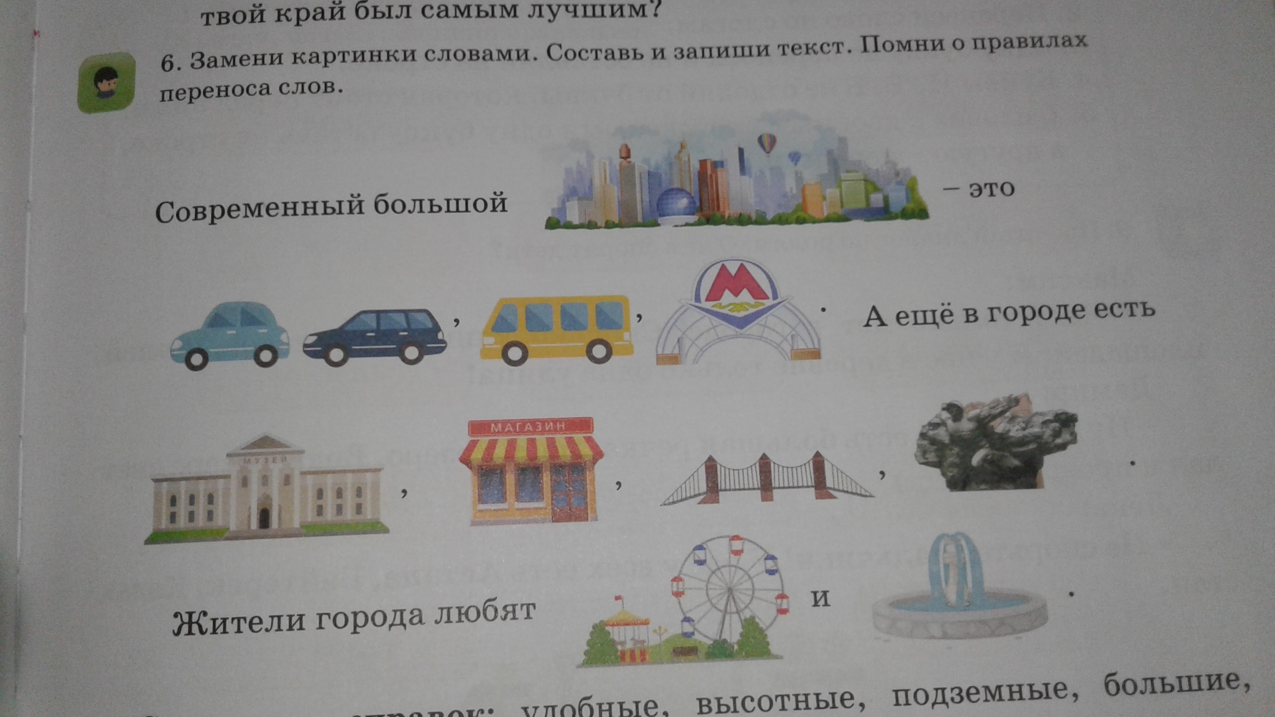 Современный большой город - это автомобили, автобусы. метро. А еще в городе есть театры, магазины, мосты, памятники. Жители города любят парки развлечений и фонтаны.