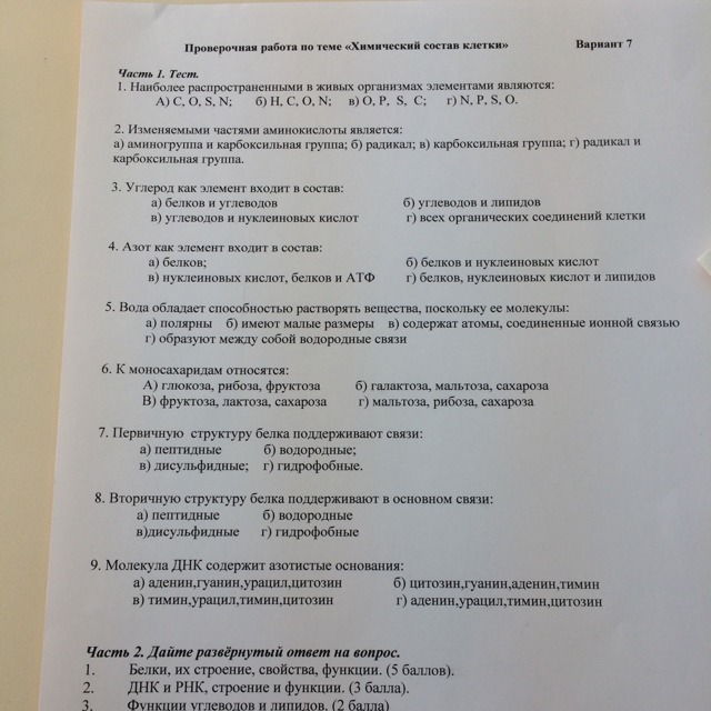 1. Белок - это биополимер, мономером которого являются аминокислоты. Аминокислоты в свою очередь состоят из неизменяемых карбоксильной и аминной группы, меняется лишь радикал, который и определяет ту или иную аминокислоту. Белки бывают четырех конфигураций (структур) - первичной (это определенная последовательность аминокислот, связанных пептидной ковалентной связью), вторичной (спираль из цепи аминокислот, связанных уже водородной связью), третичной (или ее еще называют глобула - клубок из той спирали, связанной водородной, ионной, ковалентной или гидрофобнойгидрофильной связью) и четвертичной (совокупность нескольких глобул, характерна не для всех белков, т.к. для ее формирования необходим "связующий элемент", так, в гемоглобине это железо). Функции весьма разнообразны: структурная (стенки клеток), каталитическая (ферменты), защитная (иммуноглобулин), запасная, рецепторная, регуляторная (гормоны), транспортная (гемоглобин), сократительная и др.