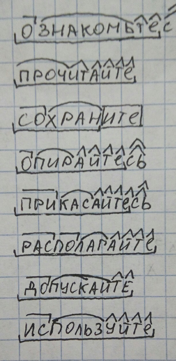 Морфемный разбор слов: ознакомьтесь; прочитайте; сохраните; опирайтесь; прикасайтесь; располагайте; допускайте; используйте