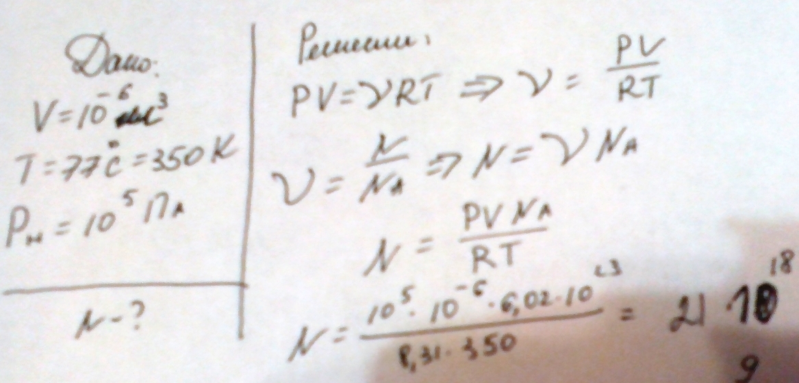 определите количество N молекул азота в сосуде объемом V=1,0 см3 при температуре t=77°C и нормальном давлении. пж