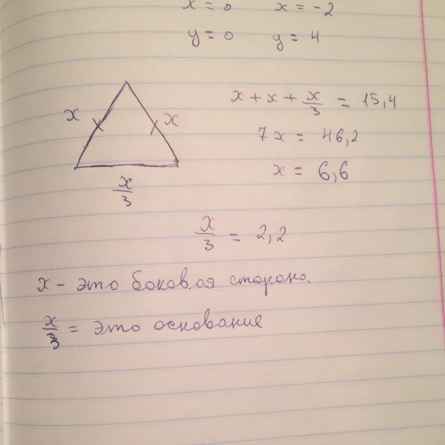 Периметр равнобедренного треугольника равен 15,4 м. найдите его стороны, если известно, что его основание меньше боковой стороны в 3 раза. (Нужно подробное решение)