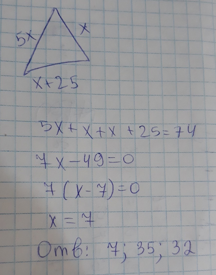 Одна из сторон треугольника в 5 раз м. чем второй и на 25 см. меньше 3-ей. Найдите стороны треугольника, если его периметр равен 74 см