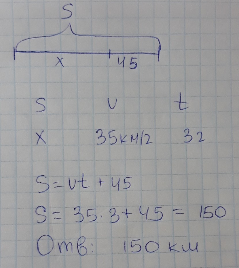 Велосипедист ехал от старта 3 ч. со скоростью 35 км/ч,и ему осталось проехать до финиша ещё 45 км.Какой длины была дистанция? РЕШИ ЗАДАЧУ УРАВНЕНИЕМ!...