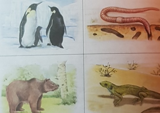 пингвины- живун на юге где очьнь холодно,черьвь-обитайт в земле,медведь живёт в лесу , зимой засыпает и спит 3-6месяцов,