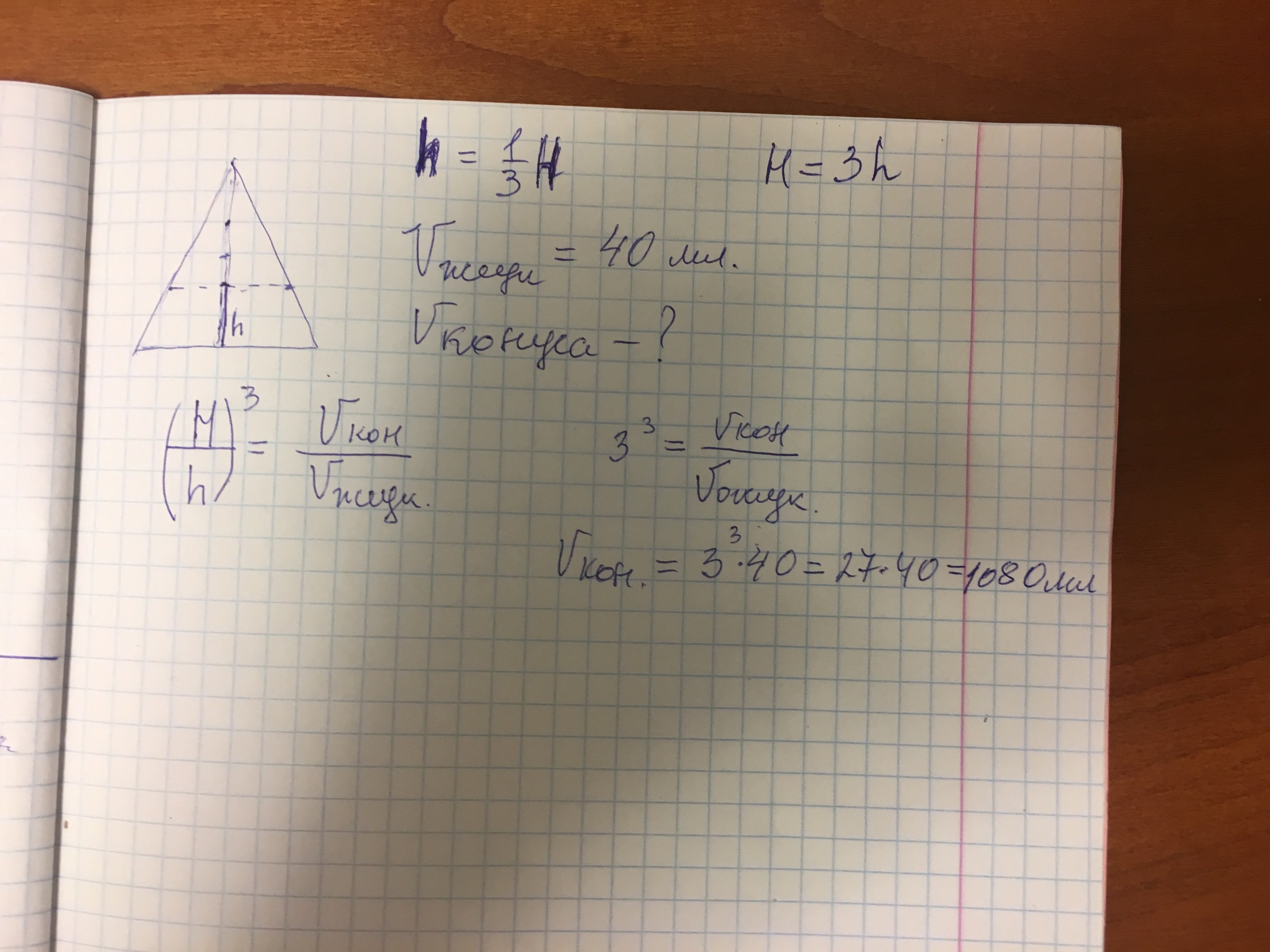 В сосуде, имеющем форму конуса, уровень жидкости достигает 1/3 высоты. Объем жидкости равен 40 мл. Найдите объем сосуда. Ответ дайте в миллилитрах.