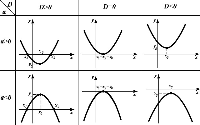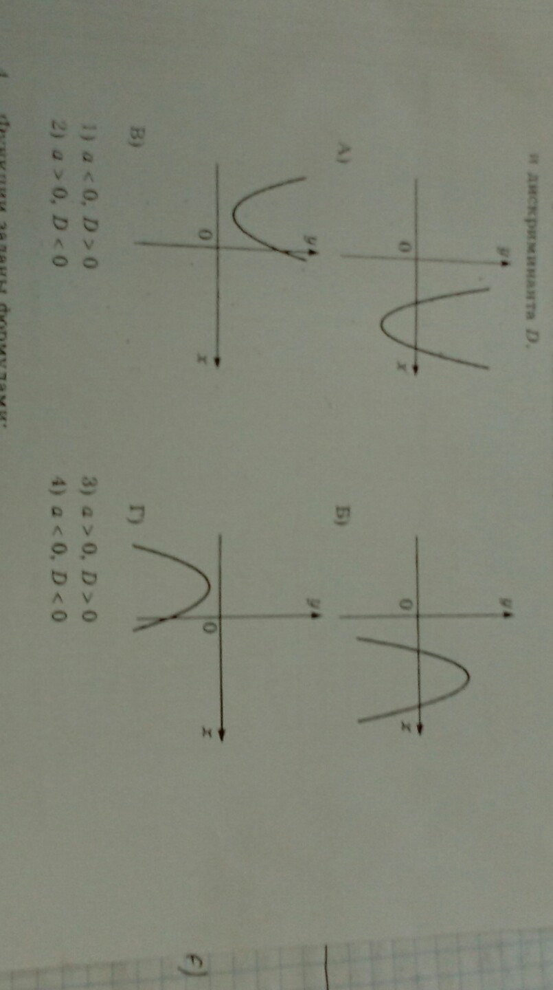 Каждому рассположению в координатной плоскости графика функции y=ax^2-bx+c поставьте в соответствие знаки коофициента а и дискриминанта D.