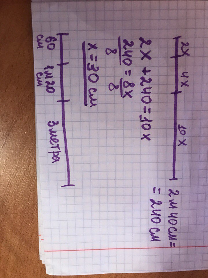 Веревка разделена на три куска пропорцианально 2:4:10, самый короткий кусок веревки короче самого длинного куска на 2м 40см. Найдите длину каждого куска веревки.