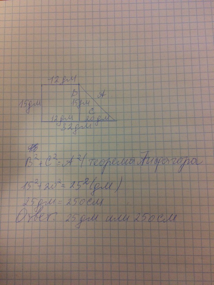 Основания прямоугольной трапеции равны 12 дм и 32 дм. Меньшая боковая сторона равна 15 дм. Вычисли большую боковую сторону трапеции.