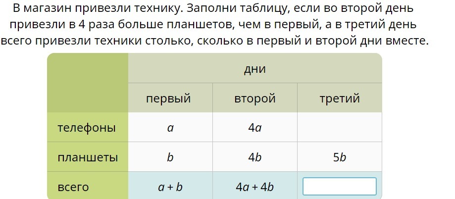 Всего: a+b+4a+4b=5a+5b; третий заполним 5а+5b;