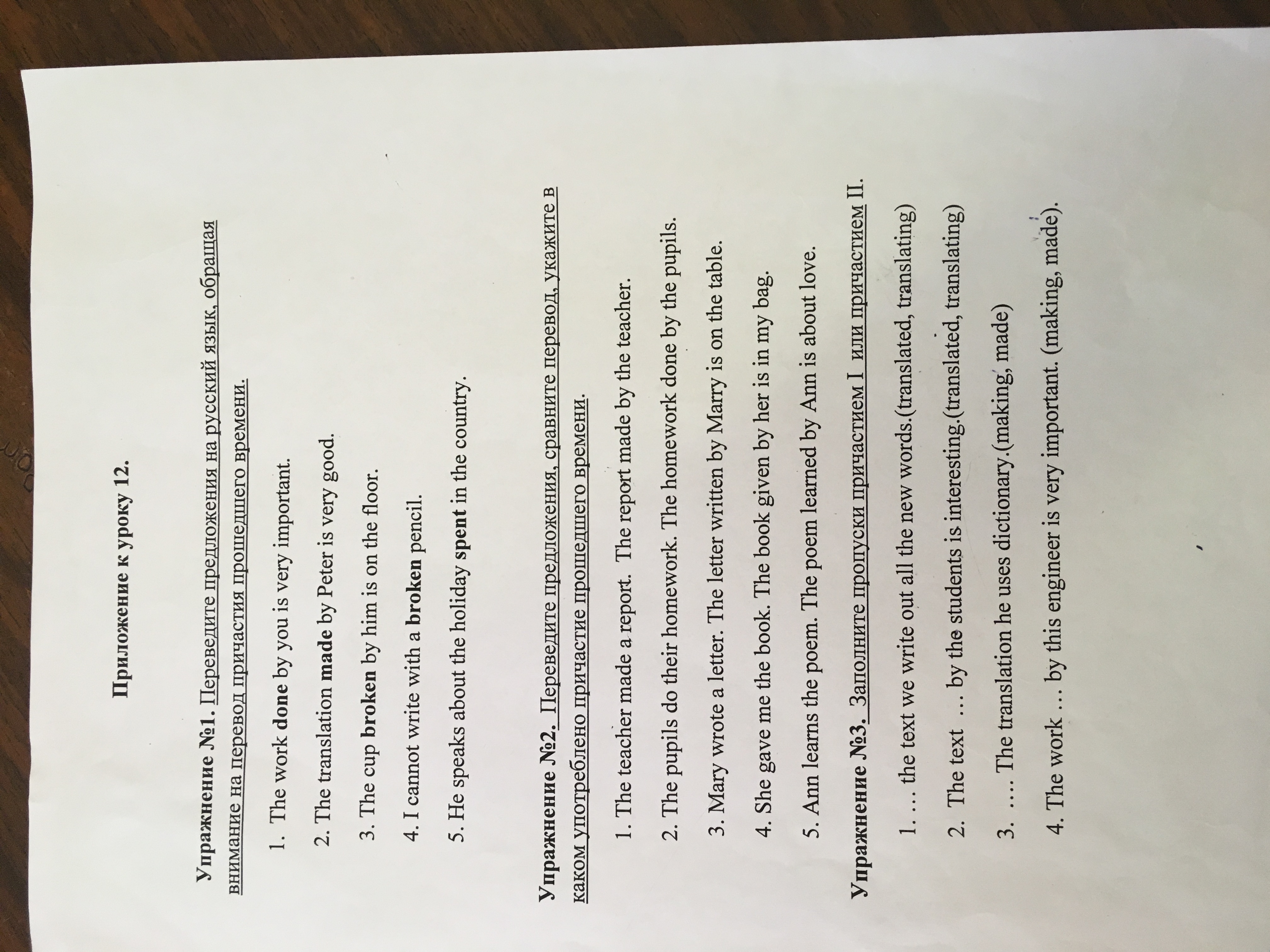 LIIe ero BpeMeHM 1. Работа, проделанная вами, очень важна. 2. Перевод, сделанный Петром, очень хорош 3. Чаша, сломанная им, находится на полу. 4. Я не могу писать сломанным карандашом. 5. Он говорит о празднике, проводимом в стране. eBo KOM 1. Учитель сделал отчет. Отчет, подготовленный преподавателем. 2. Ученики выполняют домашнее задание. Домашнее задание учеников. 3. Мария написала письмо. Письмо, написанное Марри, находится на столе. 4. Она дала мне книгу. Книга, предоставленная ею, находится в моей сумке. 5. Энн изучает стихотворение. Стихотворение, изученное Энн, посвящено любви. 1. текст мы выписываем все новые слова. (Перевод, перевод) 2. Текст студентов интересен. перевод, перевод) 3. В переводе он использует словарь. (изготовление, изготовление) 4. Работа этого инженера очень важна. (изготовление, изготовление)
