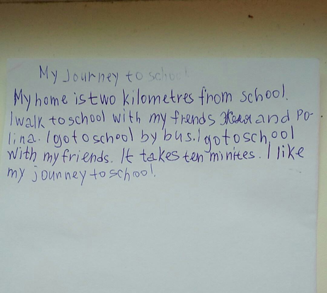 Мой дом в двух километрах от школы. Я хожу в школу с друзьями с Женей и Полиной. Добрались до школы на автобусе. Я пришла с моими друзьями в школу. Это займёт десять минут. Мне нравится моё путешествие в школу.