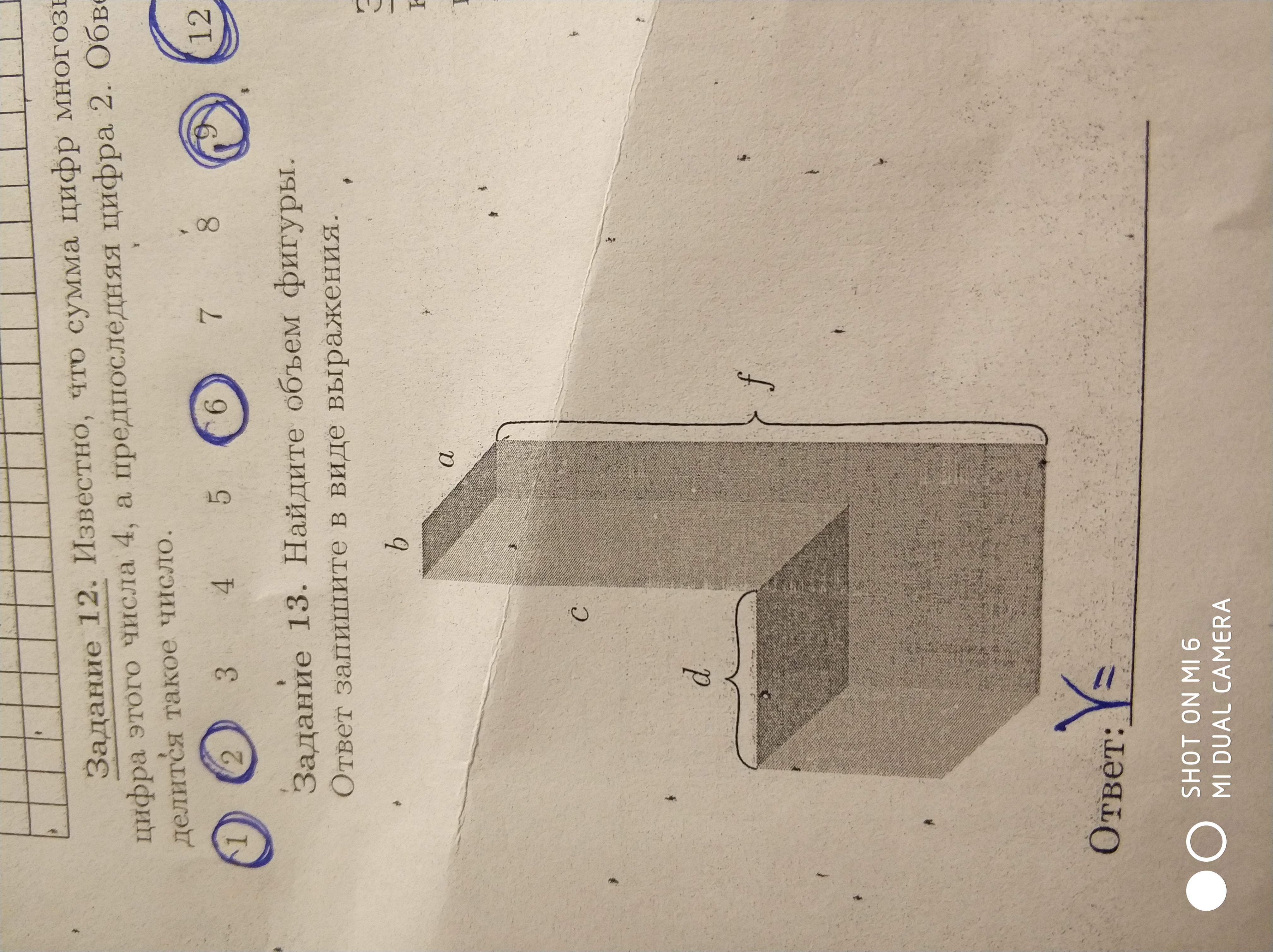 Считаем объём нижнего. Его ширина равна (d + b), высота (f - c) и глубина (а). Значит, его объём V1 = a × (d + b) × (f - c).