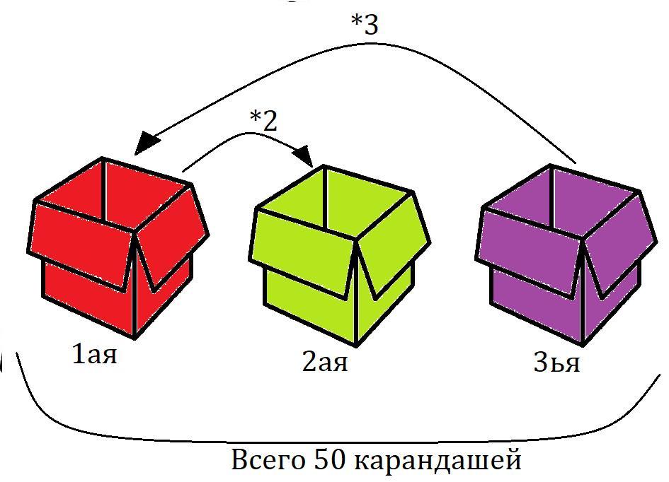 Реши задачу со схемой. В трёх коробках лежат 50 карандашей. В первой в 2 раза меньше, чем во второй и в 3 раза больше, чем в третьей. Сколько карандашей в каждой коробке?