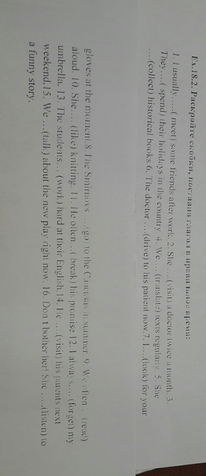 meet (Present Simple), visits (Present Simple), spend (Present Simple), translate (Present Simple), collects (Present Simple), is driving (Present Continuous), am looking (Present Continuous), are going (если будущее время)/go (если Present Simple), read (Present Simple), likes (Present Simple), breaks (Present Simple), forget (Present Simple), work (если действие регулярно)/are working (если действие происходит в данный момент), is visiting (будущее время), are talking (Present Continuous), is listening (Present Continuous)
