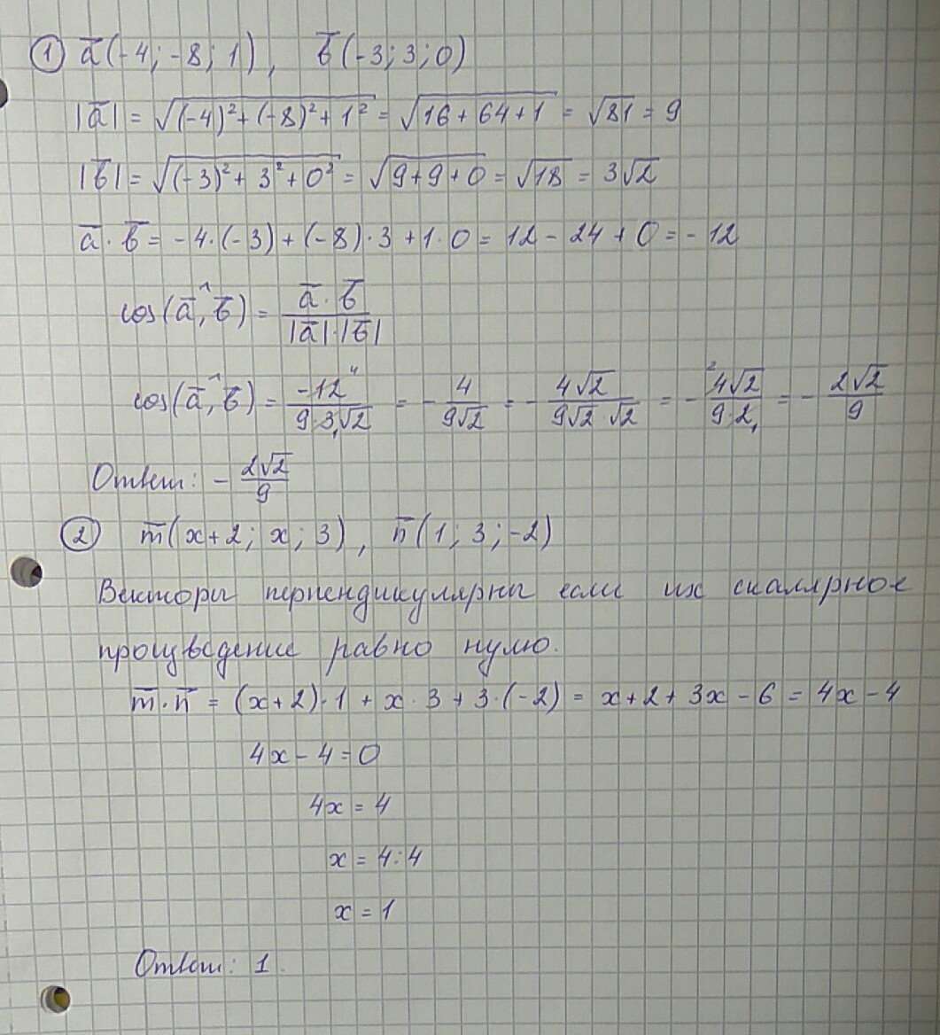 1)найдите косинус угла между векторами а и b, если а (-4, -8, 1) b (-3, 3, 0)