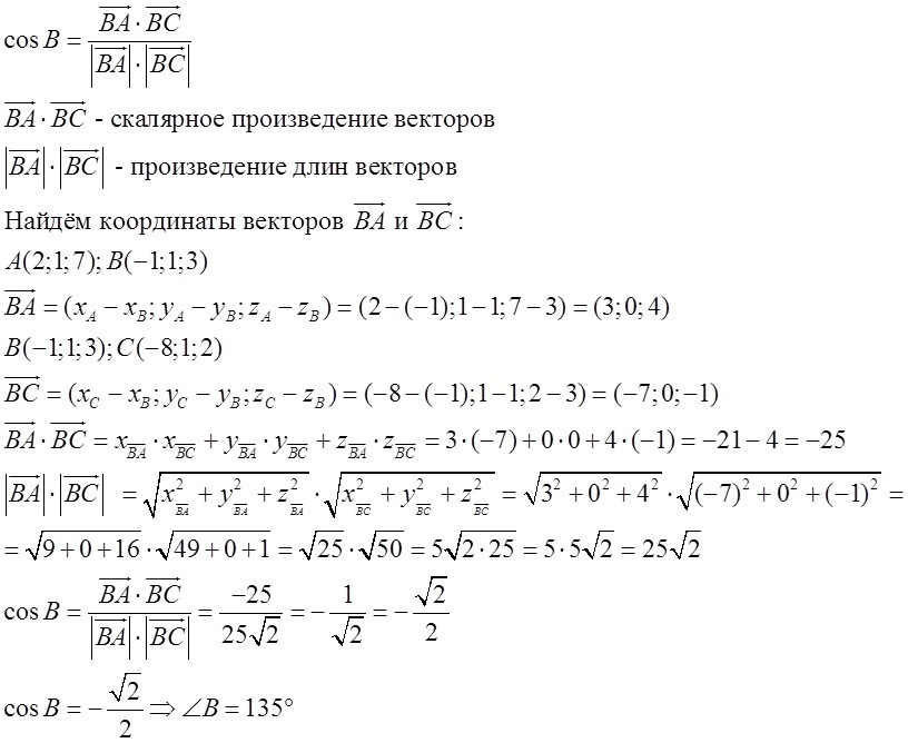 дано вершини трикутника А(2;1;7),В(-1;1;3),С(-8;1;2). знайти внутрішній кут (в градусах) привершині В