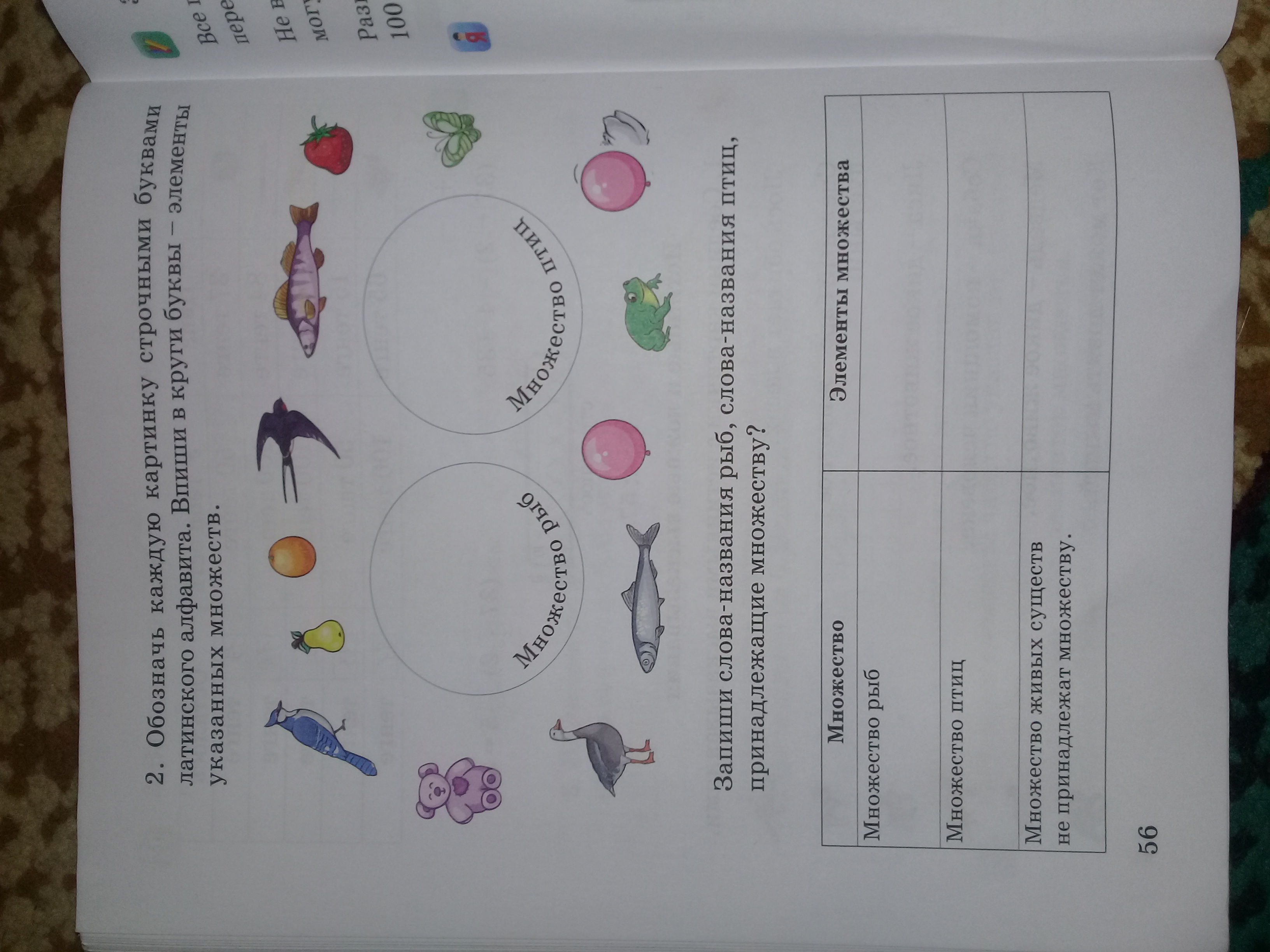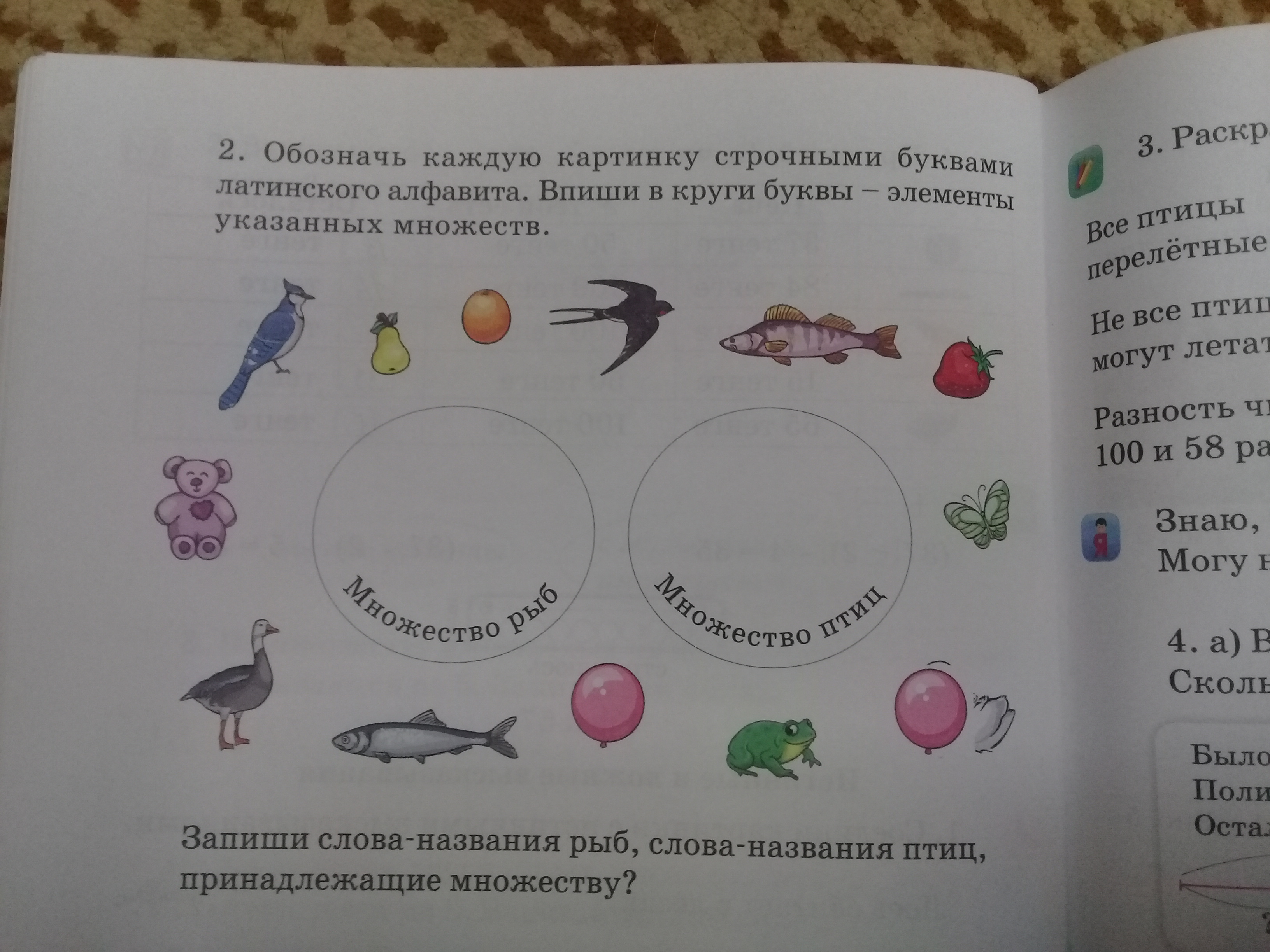 Обозначь каждую картинку строчными буквами латинского алфавита. Впиши в круги буквы-элементы указанных множеств