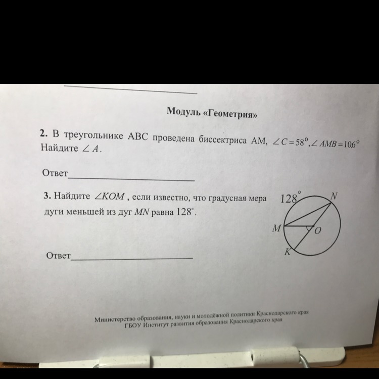 3)Найдите угол КОМ, если известно, что градусная мера дуги меньшей из дуг МN равна 128.