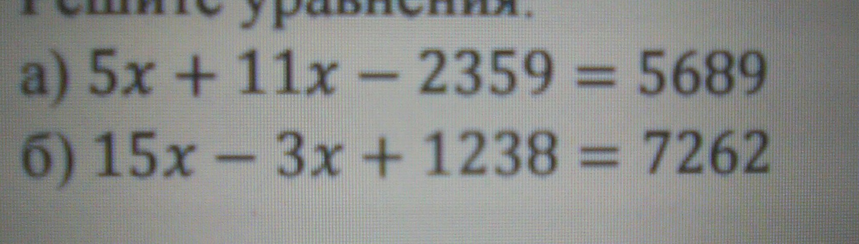 a) \ 5x + 11x - 2359 = 5689 \ 16x - 2359 = 5089 \ 16x = 5089 + 2359 \ 16x = 7448 \ x = frac{931}{2} = 465 frac{1}{2} = 465.5 \ \ \ b) \ 15x - 3x + 1238 = 7262 \ 12x + 1238 = 7262 \ 12x = 7262 - 1238 \ 12x = 6024 \ x = 502