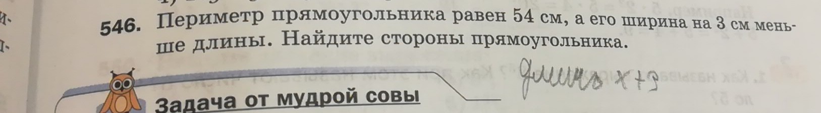 Пусть х -длина, тогда (х-3)- ширина. По условию Р=54 см и есть 4 стороны.