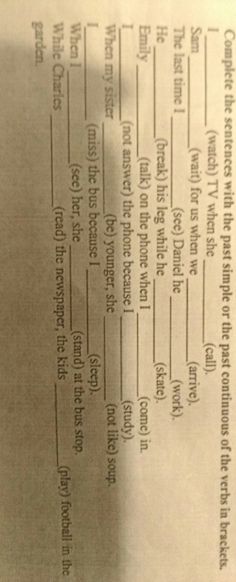 В третьем saw; was working. В четвертом broke; was skating. В пятом didn`t answer; was studing. В девятом was reading; were playing Остальные верны