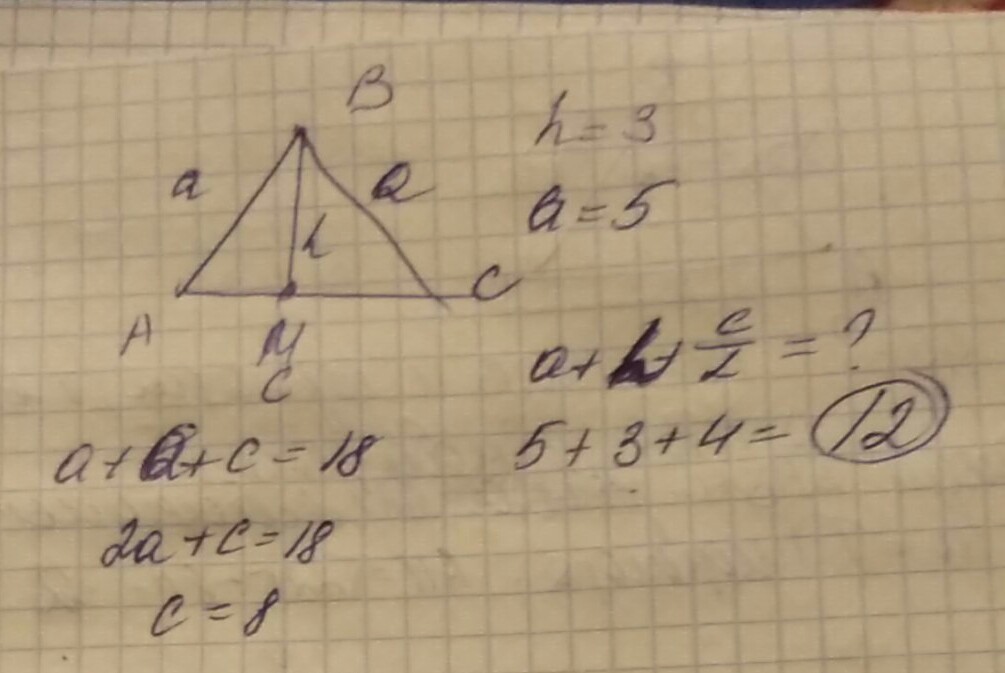 Периметр треугольника АВС = 18 см,а длина его высоты ВМ = 3 см. Определите периметр треугольника АВМ,если АВ = ВС = 5 см