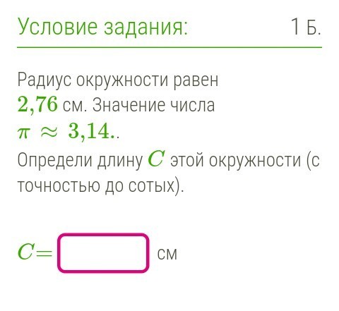 С=2·3,14·2,76=17,3328=17,33 см с точностью до сотых.