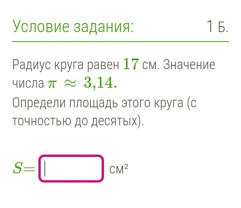 S= 3.14* 17^2=3.14*289=907.46 cм^2