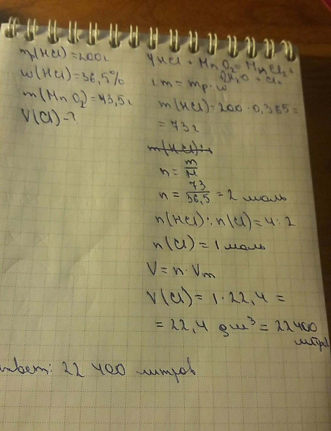 Рассчитайте, сколько литров хлора (н.у.) получится при взаимодействии 200г соляной кислоты с массовой долей 36,5% с оксидом марганца (IV) массой 43,5г