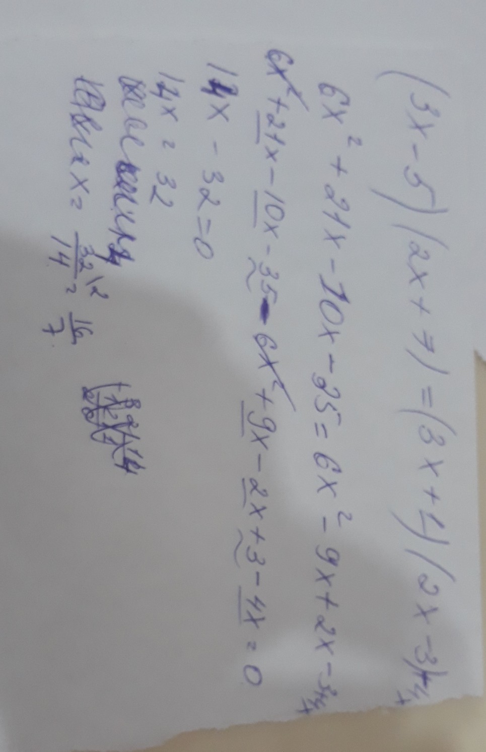 Решите уравнение (3x-5)(2x+7)=(3x+1)(2x-3)+4x.