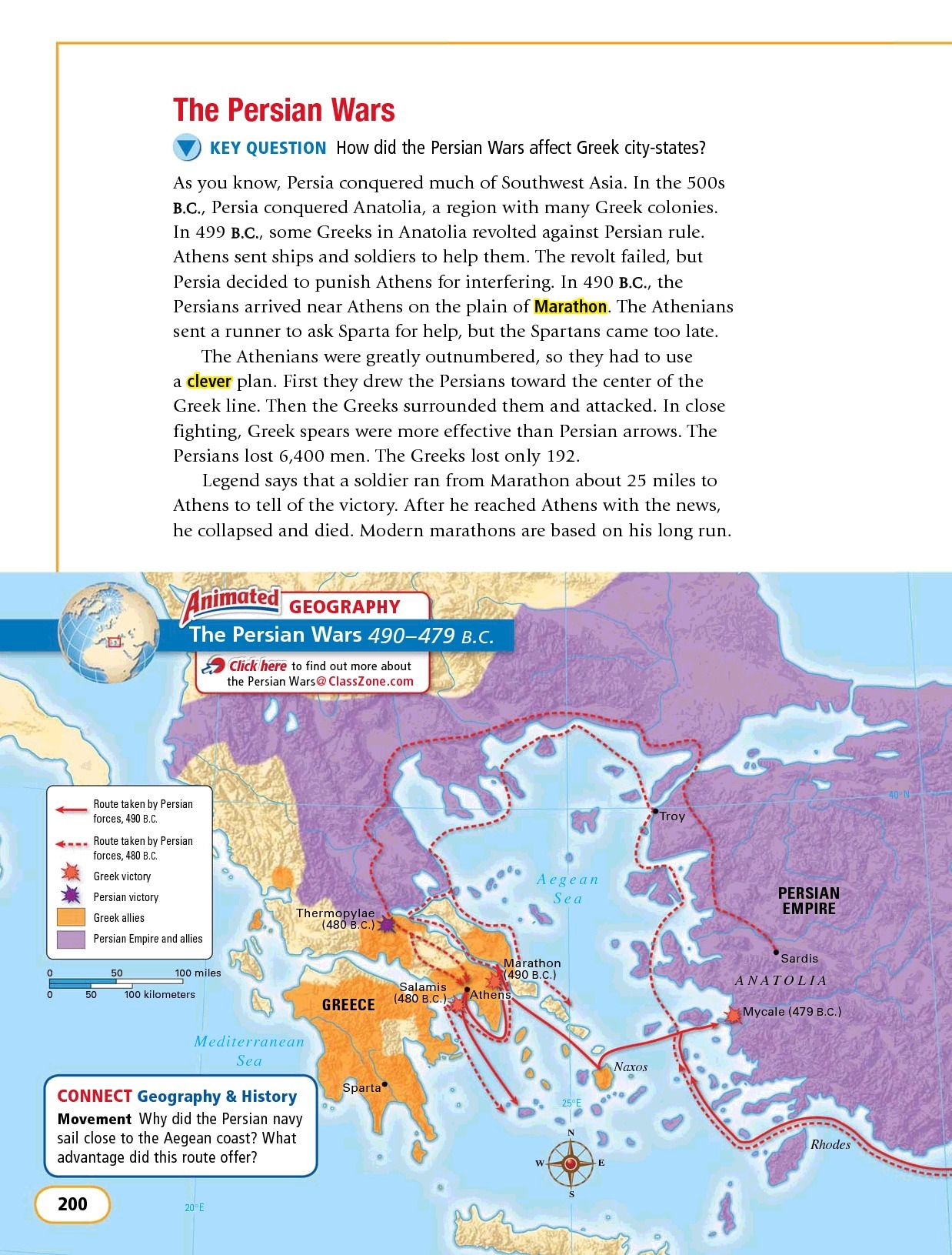 Персидские войны КЛЮЧЕВЫЙ ВОПРОС Как персидские войны повлияли на греческие городские государства? Как вы знаете. Персия завоевала большую часть Юго-Западной Азии. В 500-х годах Р.С., Персия завоевала Анатолию, регион со многими греческими колониями. В 499 году до н.э. некоторые греки в Анатолии восстали против персидского правления. Афины послали корабли и солдаты, чтобы помочь им. Восстание потерпело неудачу, но Персия решила наказать Афины за вмешательство, в 490 году до н.э. персы прибыли недалеко от Афин на равнине Марафона. Афиняне послали бегуна спросить Спарту о помощи, но спартанцы пришли слишком поздно. е Афиняне значительно превосходили численностью, поэтому им приходилось использовать умный план. Сначала они перенесли персов в центр линии Крик. Затем CFeeks окружили их и атаковали. В тесных боях греческие копья были более эффективными, чем персидские стрелы. Персы потеряли 6400 человек. Греки потеряли только 192. В легенде говорится, что солдат побежал из Марафона около 25 миль в Афины, рассказывая о победе. После того, как он добрался до Афин с новостями, он рухнул и умер. Современные марафоны основаны на его долгосрочной перспективе.