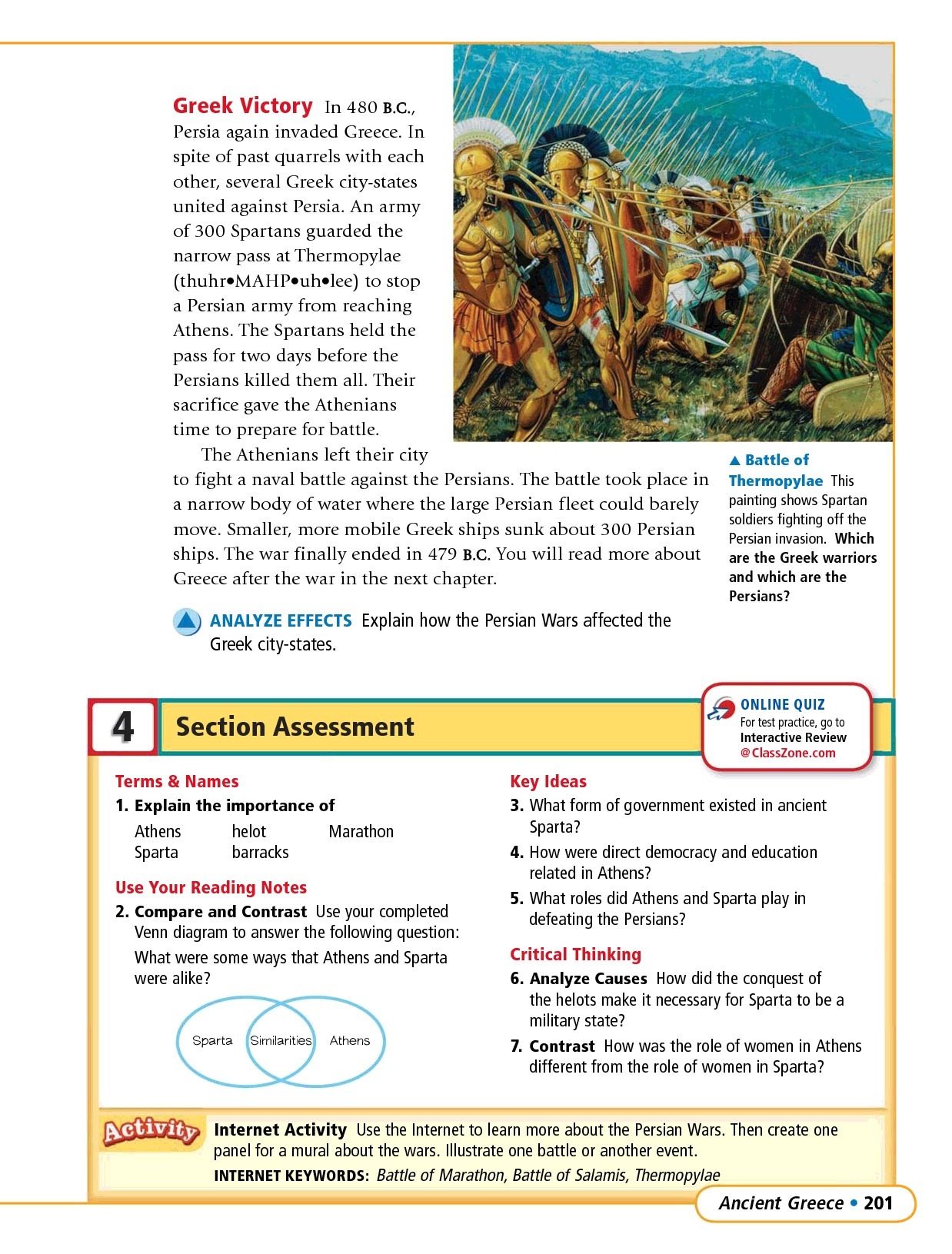 4 ONLINE QUIZ 4 Оценка раздела Для тестового pradice перейдите к интерактивному обзору Class 2ome com Условия и названия Ключевые идеи 3. Какая форма правления существовала в древности 1. Объясните важность Sparta? Афины приветствуют казармы Marathon Sparta 4. Каким образом прямая демократия и образование связаны с Афинами? Используйте свои заметки о чтении 5. Роли Wiat сделали Афины и Спарта в 2. Сравните и Контраст Используйте свое завершенное поражение персов? Диаграмма Венна, чтобы ответить на следующий вопрос: Каковы были некоторые способы, с помощью которых Афины и Спарта критиковали мышление? 6. Анализ причин. Как завоевание илотов потребовало, чтобы Спарта была военным государством? 7. Контраст Как роль женщин в Афинах отличалась от роли женщин в Спарте? Активность в Интернете Использование Интермета, чтобы узнать больше о Персидских войнах. Затем создайте одну панель для росписи о войнах. Проиллюстрируйте одно сражение или другое событие. INTERNETKEYWORDS: Battie of Marathon