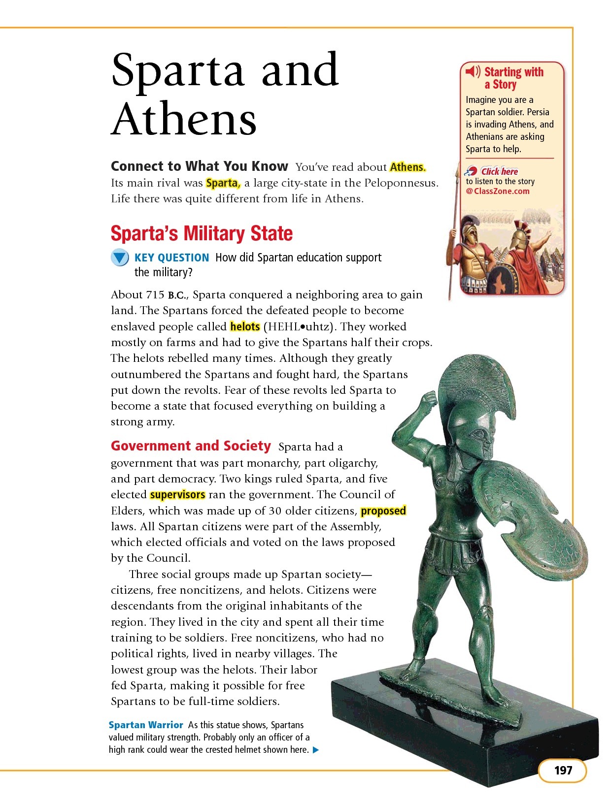 Спарта и Афины Подключитесь к тому, что вы знаете. Вы читали об Афинах. Его главным соперником была Спарта, крупное городское государство в Пекпоннесе, Жизнь была совершенно иной, чем жизнь в Афинах. Военное государство Спарта. КЛЮЧЕВЫЙ ВОПРОС. Как спартанское образование поддерживало военных? Около 715 г. до н.э. Спарта завоевала приземляющуюся землю. Спартанцы заставили побежденных людей стать порабощенными людьми, называвшимися ионами (HEHI.uhta). Они в основном играли на фермах и вынуждены были давать спартанцам луковичные культуры. Илоты многократно повторялись. Хотя они намного превосходили численностью спартанцев и сражались за руки, спартанцы подавляли Девольтов. Страх перед этими восстаниями заставил Спарту стать сунном, который сфокусировал все на строительстве сильной армии. Правительство и общество спарты имели правительство, которое было частью монархической части олигархии и частичной демократии. Два царя управляли Спартой и пятью избранными начальниками уаа, правительством. Совет старейшин, в состав которого входили пожилые люди Мо, предложил законы. Все спартанские граждане были частью Ассамблеи, которая избрала должностных лиц и голосовала по полосам, предложенным Советом. Три социальных группы, составляющие спартанское общество, сбегают с нецитизма и исходят. Граждане были потомками из первоначальных житейских регионов. Они жили в городе и проводили все свое обучение, чтобы быть солдатами. Свободные нерикьяны, не имеющие политических прав, жили в близлежащих деревнях. Самая низкая группа была слава. Их труд накормил Спарту, заставив его погладить далеко свободных спартанцев, чтобы они были полными солдатами.
