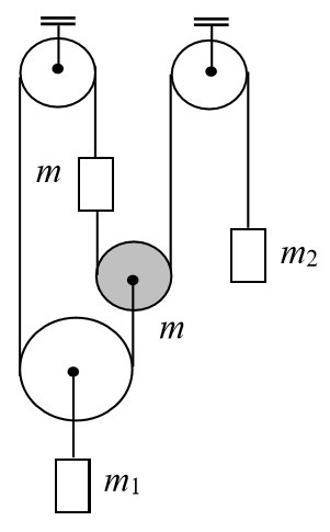 Система состоит из нескольких грузов, подвешенных на невесомых нитях, перекинутых через невесомые и один массивный (выделен серым цветом) блоки. Масса m = 1 кг. Определите, при каких значениях масс m1 и m2 система будет находиться в равновесии. Трения в осях блоков нет