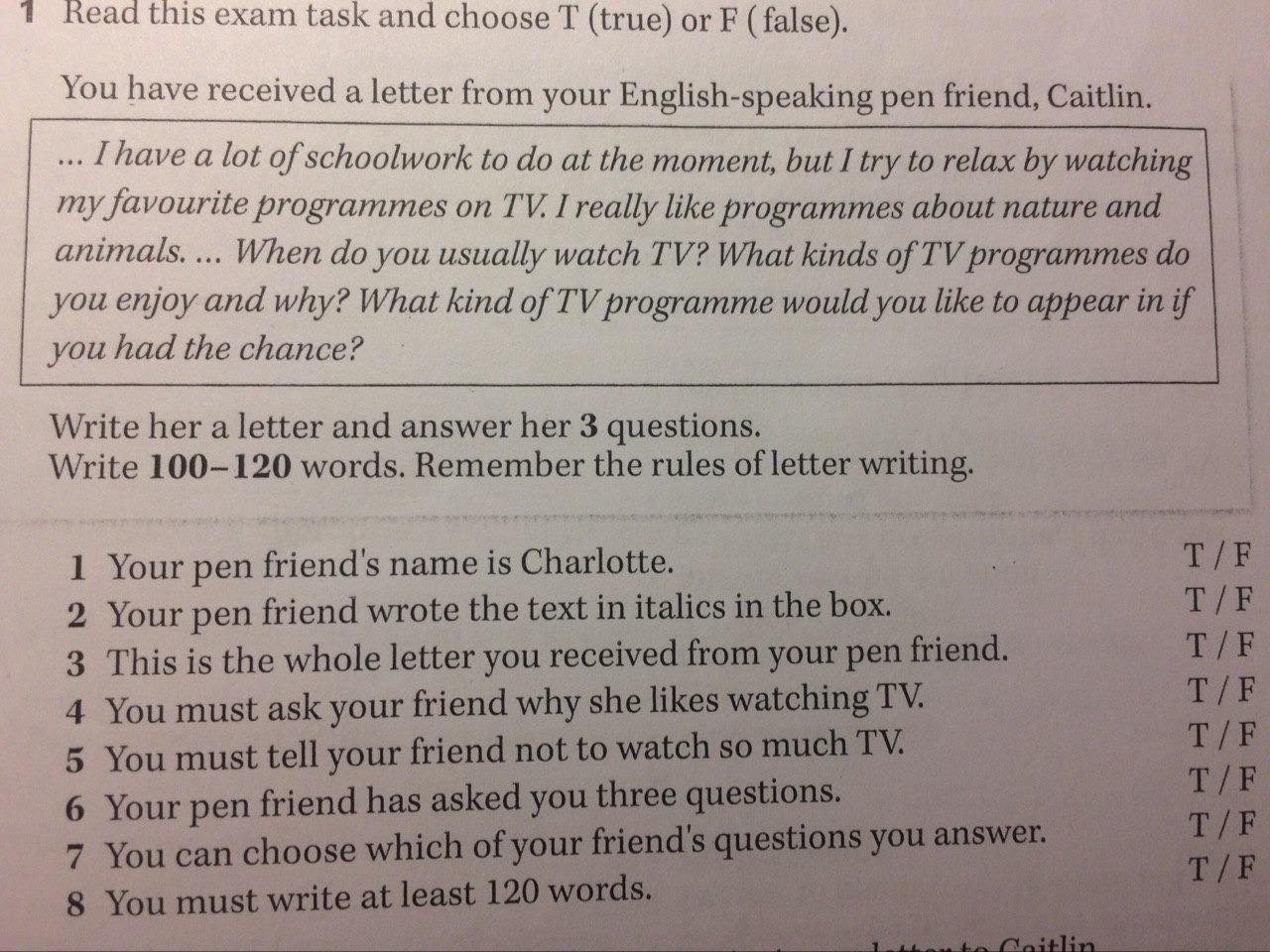 Hello Caitlin,Thank you for your letter. I hope you will get some rest soon. To tell the truth, I do not watch TV, because it is not interesting and rather politized in our country. My parents and gradparents watch TV news and TV series and even all that strange TV shows where everyone is screaming and yelling and even fighting :-) But I do not like it at all. I watch Youtube - there is no adds and I can choose whatever I want. And I do not want to take part in any TV programme - I don't like them.Best regards