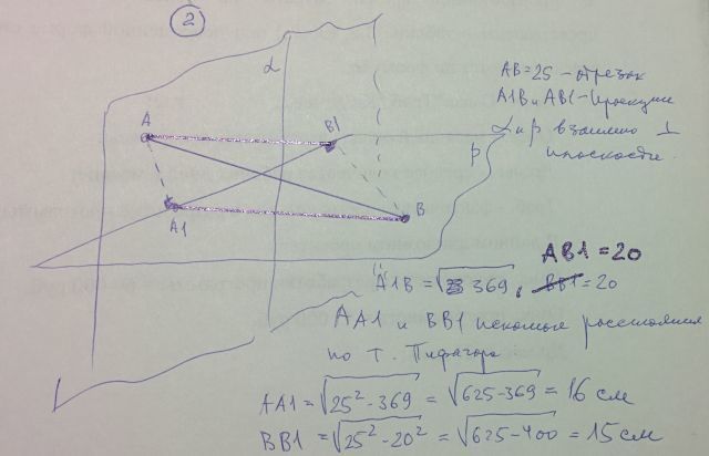 Рус: Отрезок длиной 25 см опирается концами на две взаимно перпендикулярные плоскости. Проекции отрезка на эти плоскости равны √369 см и 20 см. Найти расстояние от концов отрезка к данным плоскостей.
