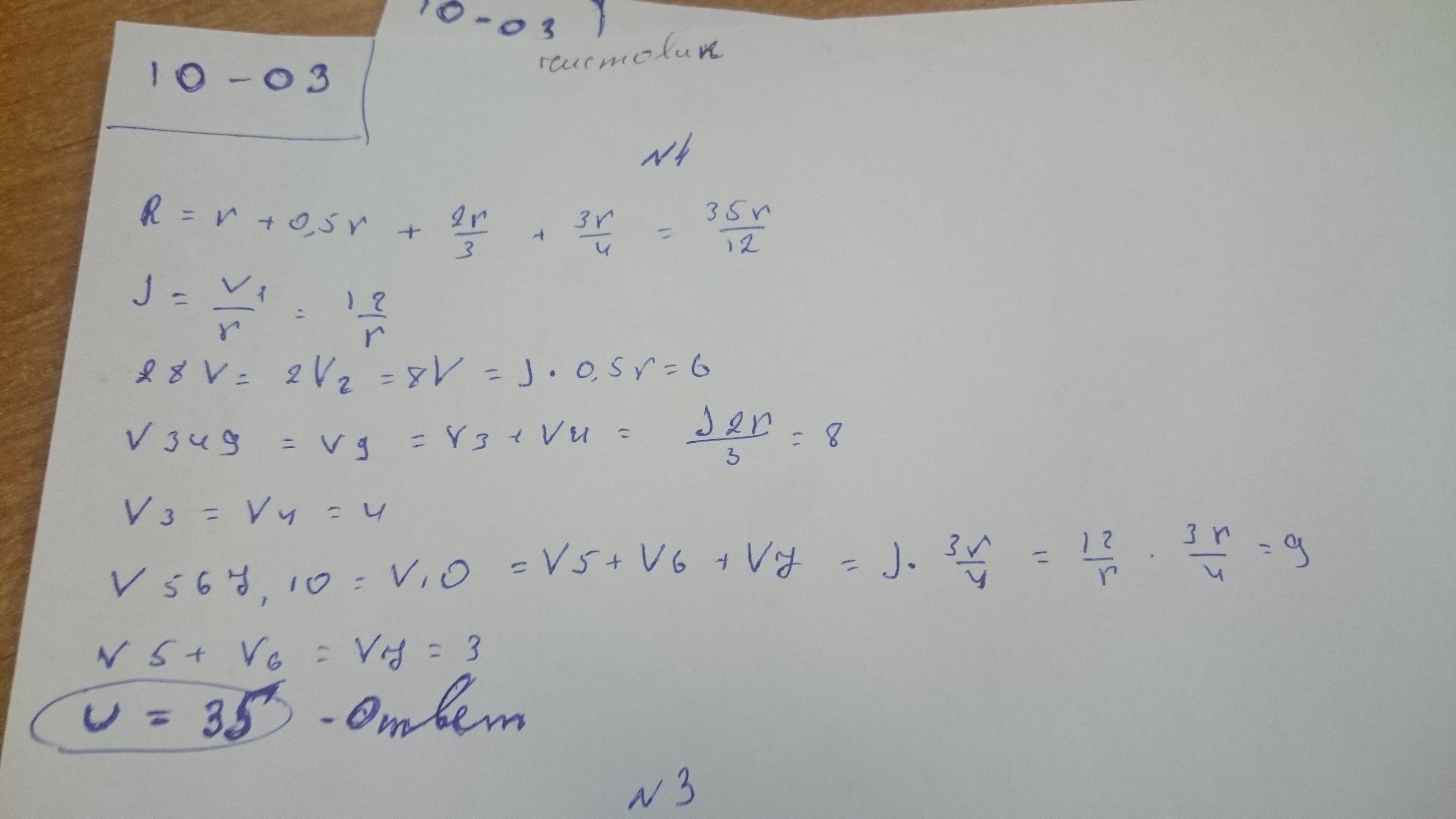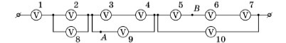 Электрическая цепь составлена из 10 одинаковых вольтметров. Показания вольтметра №1 равно U1 = 12 В. Определите показания остальных вольтметров и напряжение между точками А и В.