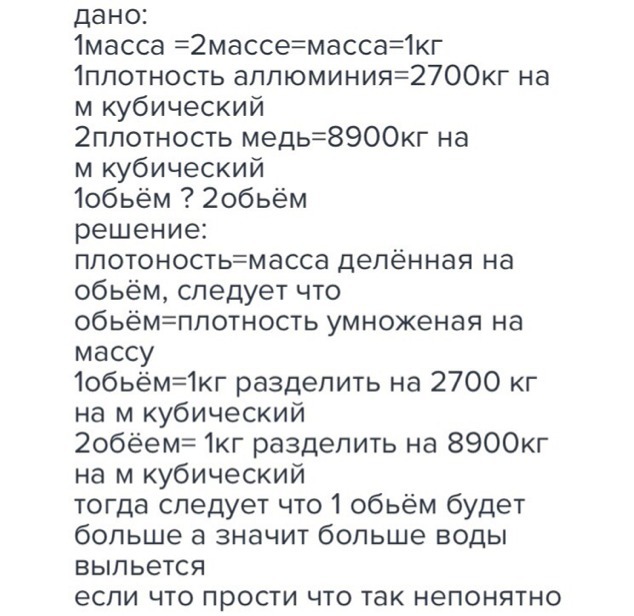 Сосуд полностью заполнен водой. В каком случае из сосуда выльется больше воды: при погружении 1 кг меди или 1 кг аллюминия? Ответ объясните.