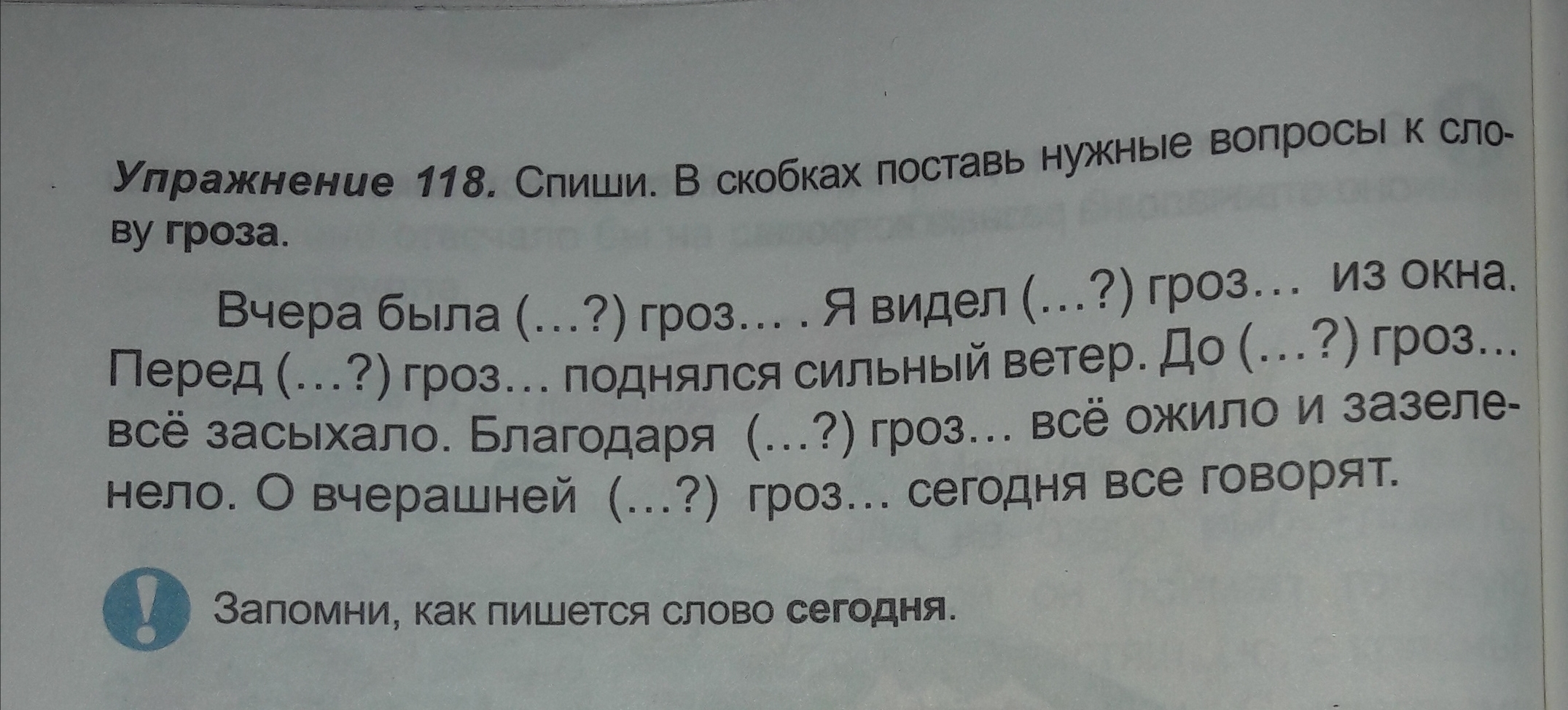 Вчера была (что?) гроза. Я видел (что?) грозу из окна. Перед (чем?) грозой поднялся сильный ветер. До (чего?) грозы всё засыхало. Благодаря (чему?) гроза всё ожило и зазеленело. О вчерашней (о чём?) грозе сегодня все говорят.