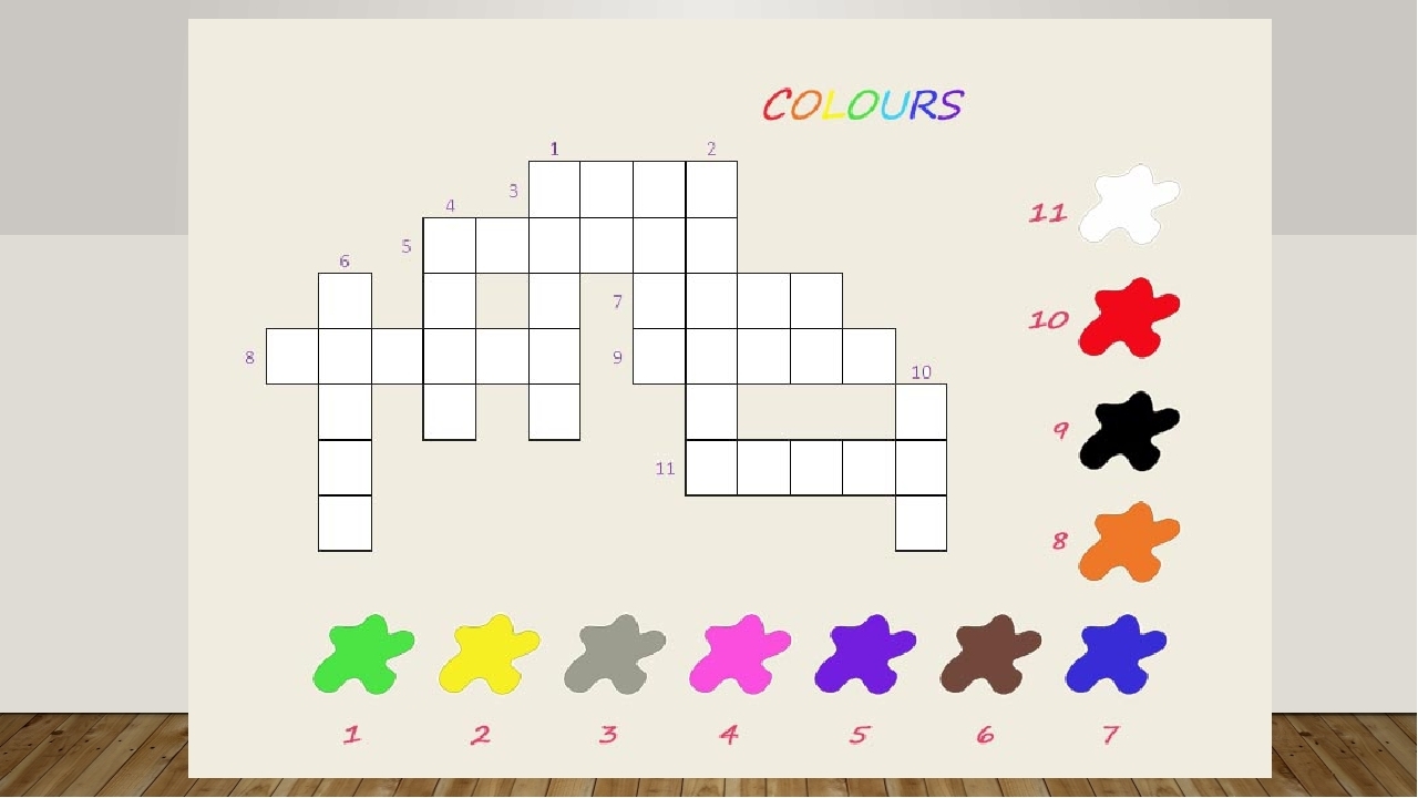 Англисские цвета : 1/green 2\yellow/3.gray 4\pink 5\purple 6\brown 7\blue 8\orange\ 9\blak 10\red\11\white