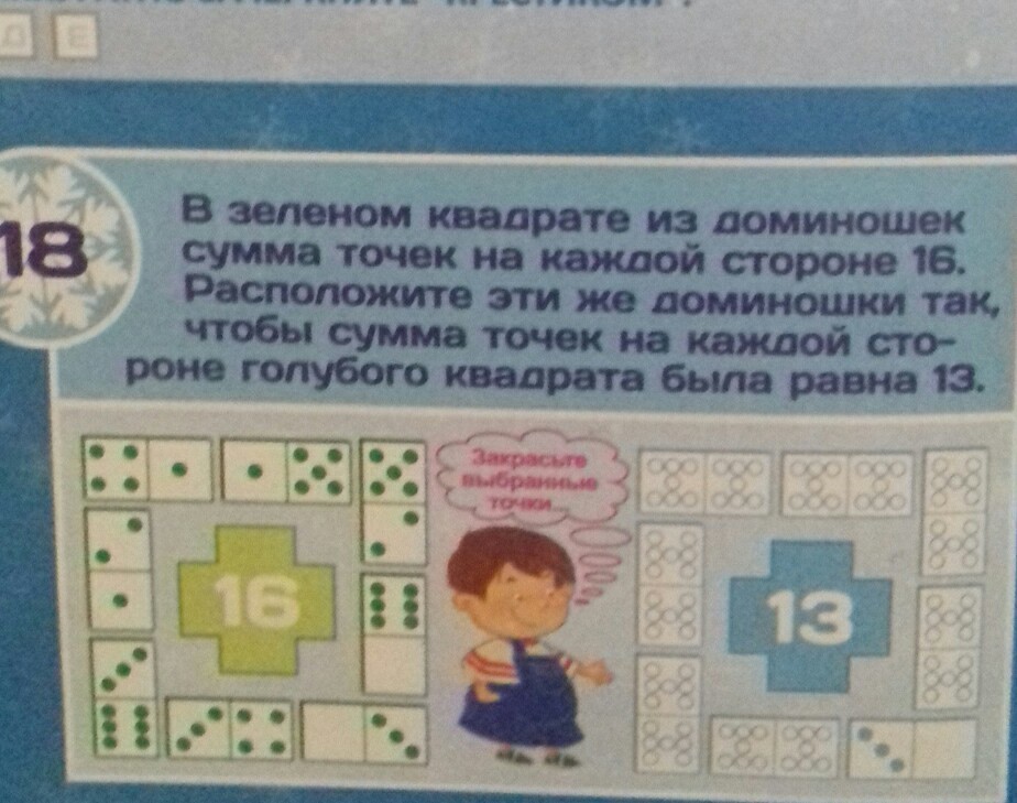 в зеленом квадрате из доминошек сумма точек на каждой стороне 16. Расположите эти же доминошки так чтобы сумма точек на каждой стороне голубого квадрата была равна 13