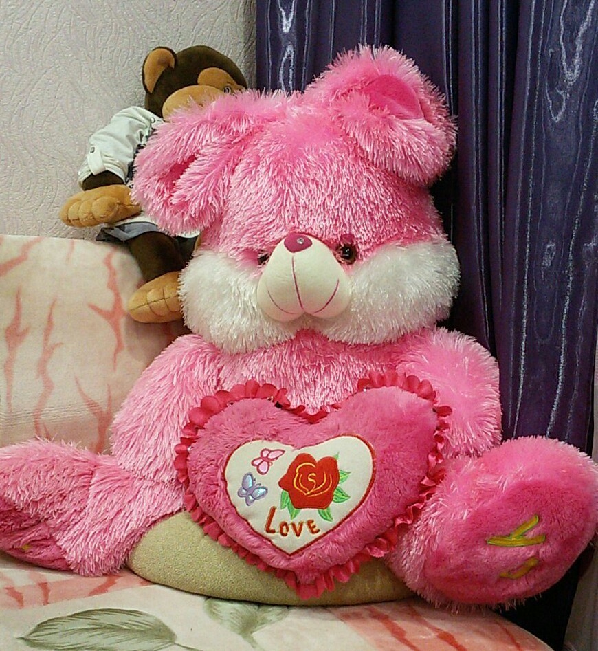Мой заяц ярко-розового цвета держит в своих лапках сердце с надписью «люблю».