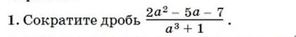2a^2-5a-7=0; D=(-5)^2-4*2*(-7)=25+56=81; a1=(5-9)/4, a2=(5+9)/4. a1= -1, a2=14/4=7/2. получаем: 2a^2-5a-7=2*(a-7/2)*(a+1)=(2a-7)*(a+1). a^3+1=(a+1)*(a^2-a+1). получаем : (2a-7)*(a+1) / (a+1)*(a^2-a+1)=(2a-7) / (a^2-a+1).
