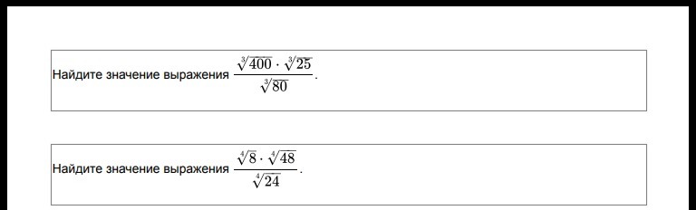 1) ![frac{ sqrt[3]{400}* sqrt[3]{25} }{ sqrt[3]{80} }= sqrt[3]{ frac{2 ^{4} *5 ^{2}*5 ^{2} }{2 ^{4}*5 } }= sqrt[3]{5 ^{3} } =5 frac{ sqrt[3]{400}* sqrt[3]{25} }{ sqrt[3]{80} }= sqrt[3]{ frac{2 ^{4} *5 ^{2}*5 ^{2} }{2 ^{4}*5 } }= sqrt[3]{5 ^{3} } =5](https://tex.z-dn.net/?f=+frac%7B+sqrt%5B3%5D%7B400%7D%2A+sqrt%5B3%5D%7B25%7D++%7D%7B+sqrt%5B3%5D%7B80%7D+%7D%3D+sqrt%5B3%5D%7B+frac%7B2+%5E%7B4%7D+%2A5+%5E%7B2%7D%2A5+%5E%7B2%7D++%7D%7B2+%5E%7B4%7D%2A5+%7D+%7D%3D+sqrt%5B3%5D%7B5+%5E%7B3%7D+%7D+%3D5++)