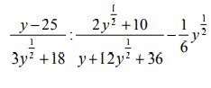 frac{y-25}{3 y^{ frac{1}{2} } +18} : frac{2 y^{ frac{1}{2}}+10}{y+12 y^{ frac{1}{2}}+36}- frac{1}{6} y^{ frac{1}{2} } }