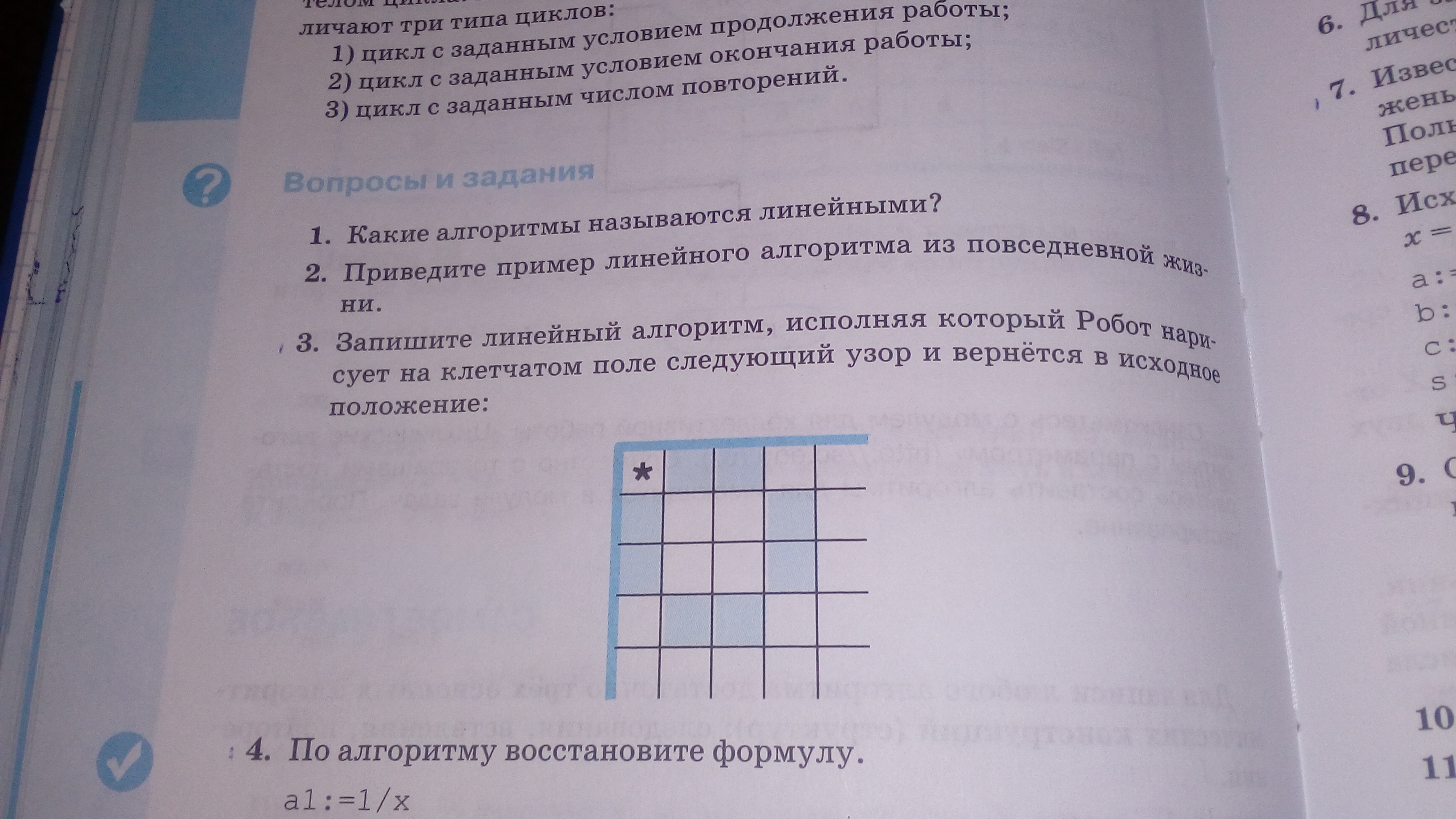 Запишите линейный алгоритм, исполняя который робот нарисует на клетчатом поле следующий узор и вернётся в сходное положение.