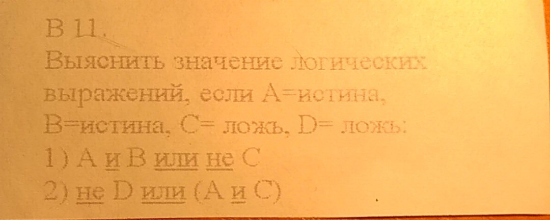Выяснить значение логических выражений, если А=истина, В=истина, С=ложь, D=ложь: 1) А и В или не С. 2) не D или (А и С)