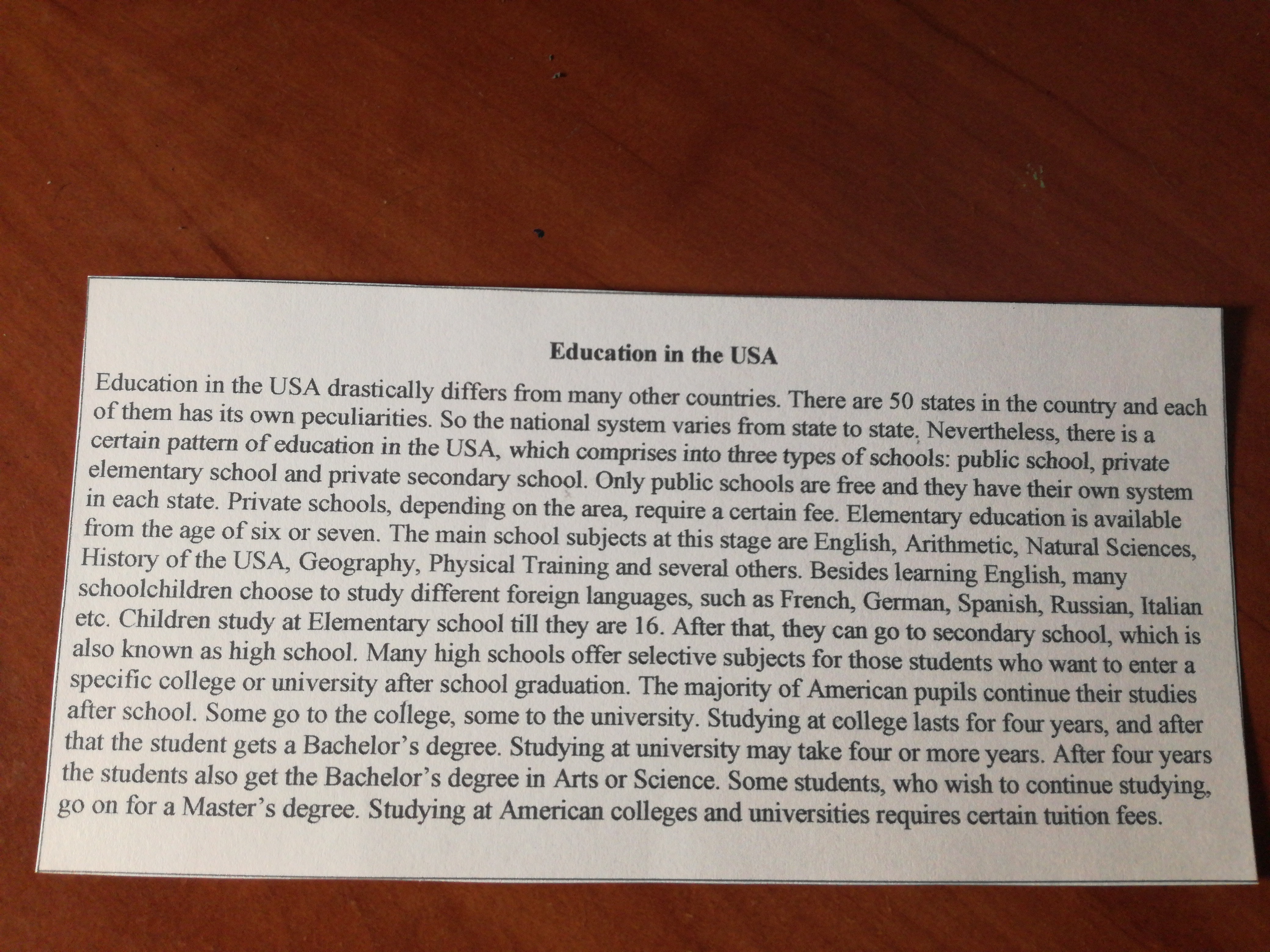 Образование в США. Образование в США резко из многих других стран. В стране 50 государств. У каждого из них свои особенности, поэтому национальная система варьируется от штата к Тем не менее, в США существует государственная государственная школа, элементарный, который относится к типам школ в каждой школе и частной средней школе. Только государственные школы являются бесплатными, и у них есть своя система из государственных частных школ, в зависимости от района, требуется определенная плата. Начальное образование доступно в возрасте шести или семи предметов основной школы на данном этапе: английский, арифметика, естественные науки. История США, география, физическое воспитание и ряд других. Помимо изучения английского языка, школьники-мужчины предпочитают изучать разные иностранные языки, такие как немецкий, русский, русский и т. Д. Дети учатся в начальной школе, пока им не исполнится 16. После этого они могут перейдите в среднюю школу, которая также известна как средние школы средней школы Мати, предлагающие выборочные предметы для тех, кто хочет получить конкретный колледж или университет после окончания школы. Большинство американских учеников продолжают учебу после школы. Некоторые из них к четырем, что студент получает степень бакалавра. Учеба в университете может занять четыре или более лет. Через четыре года студенты также получают степень бакалавра в области искусств или науки. Некоторые студенты, которые хотят продолжить учебу, продолжают учебу в магистратуре , Обучение в американских колледжах и университетах требует определенной платы за обучение