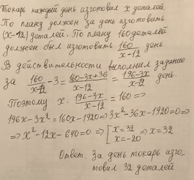 Токарь планировал за некоторое время изготовить 160 деталей. Однако он выполнил это задание на 3 дня раньше срока, так как изготавливал ежедневно на 12 деталей больше, чем планировал. Сколько деталей токарь изготавливал ежедневно. Если можно то с подробным решением.ЗАРАНЕЕ СПАСИБО.
